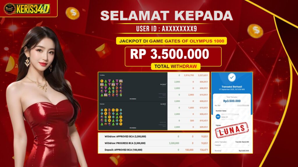 Setiap hari, member KERIS34D berhasil meraih jackpot besar dari berbagai provider slot ternama yang kami sediakan, seperti Pragmatic Play, Habanero, PG Soft, dan masih banyak lagi. Kami secara rutin menampilkan bukti screenshot atau rekapan kemenangan yang berhasil diraih, mulai dari kemenangan ratusan ribu hingga puluhan juta rupiah. Semua slip kemenangan ini kami hadirkan untuk membuktikan bahwa di KERIS34D, peluang menang itu nyata
