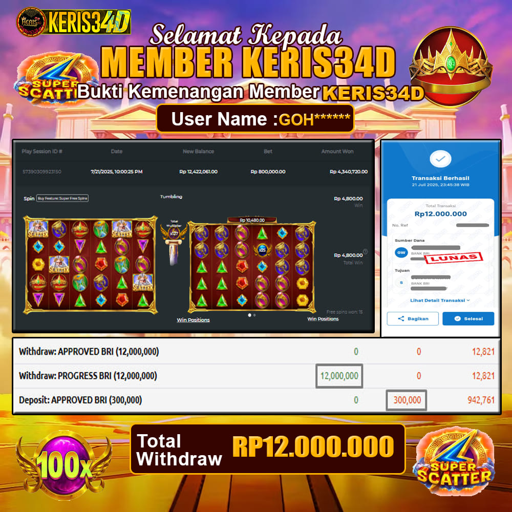Setiap hari, member KERIS34D berhasil meraih jackpot besar dari berbagai provider slot ternama yang kami sediakan, seperti Pragmatic Play, Habanero, PG Soft, dan masih banyak lagi. Kami secara rutin menampilkan bukti screenshot atau rekapan kemenangan yang berhasil diraih, mulai dari kemenangan ratusan ribu hingga puluhan juta rupiah. Semua slip kemenangan ini kami hadirkan untuk membuktikan bahwa di KERIS34D, peluang menang itu nyata