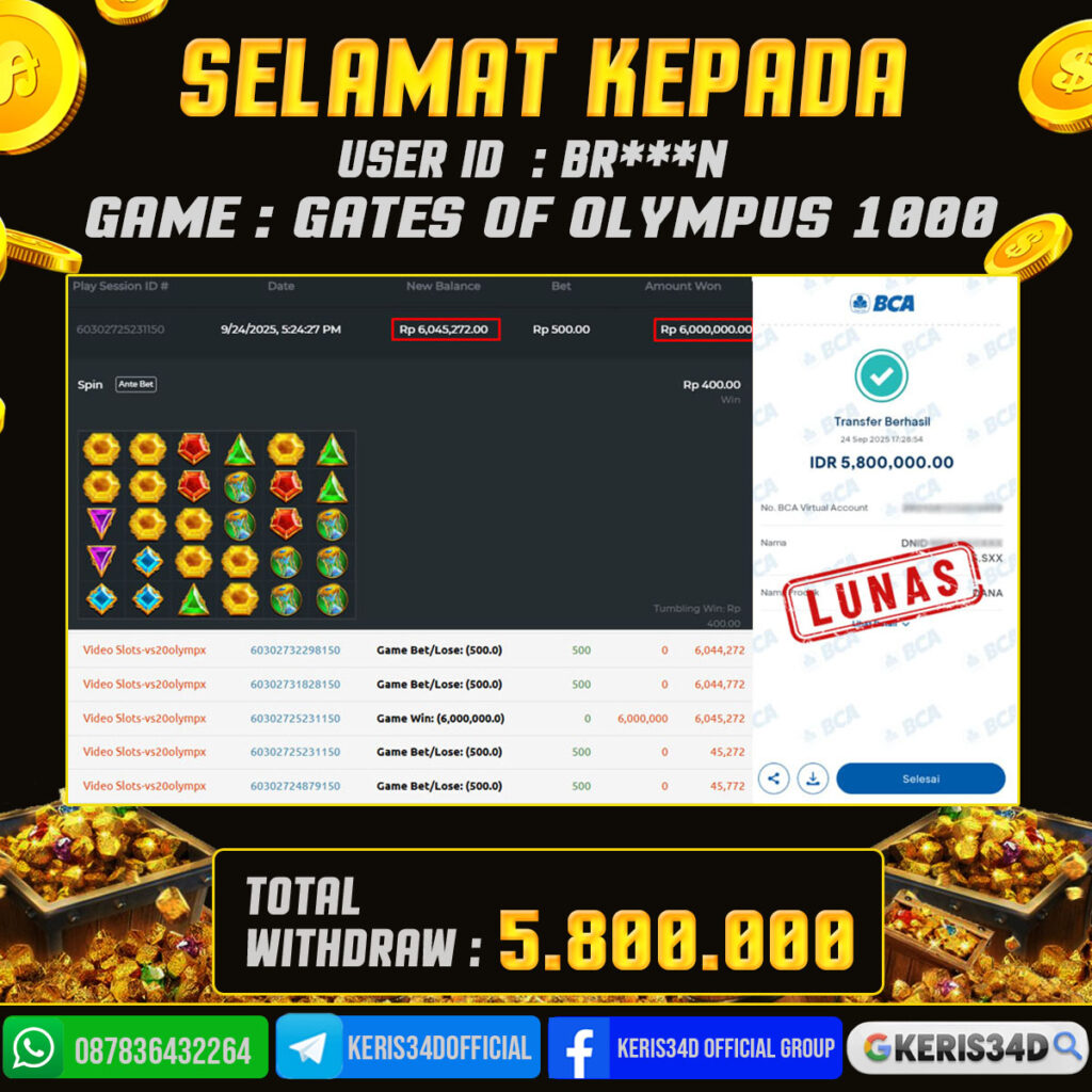 Setiap hari, member KERIS34D berhasil meraih jackpot besar dari berbagai provider slot ternama yang kami sediakan, seperti Pragmatic Play, Habanero, PG Soft, dan masih banyak lagi. Kami secara rutin menampilkan bukti screenshot atau rekapan kemenangan yang berhasil diraih, mulai dari kemenangan ratusan ribu hingga puluhan juta rupiah. Semua slip kemenangan ini kami hadirkan untuk membuktikan bahwa di KERIS34D, peluang menang itu nyata