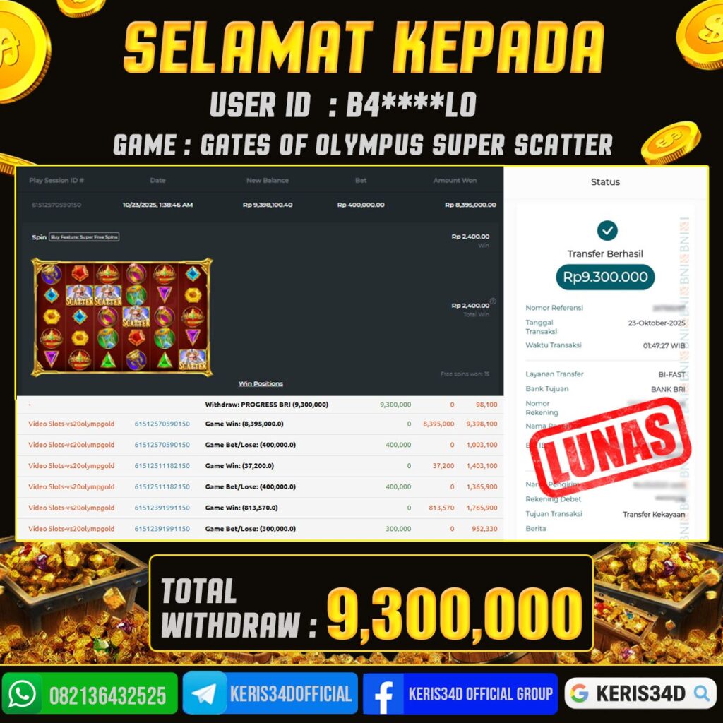 Setiap hari, member KERIS34D berhasil meraih jackpot besar dari berbagai provider slot ternama yang kami sediakan, seperti Pragmatic Play, Habanero, PG Soft, dan masih banyak lagi. Kami secara rutin menampilkan bukti screenshot atau rekapan kemenangan yang berhasil diraih, mulai dari kemenangan ratusan ribu hingga puluhan juta rupiah. Semua slip kemenangan ini kami hadirkan untuk membuktikan bahwa di KERIS34D, peluang menang itu nyata