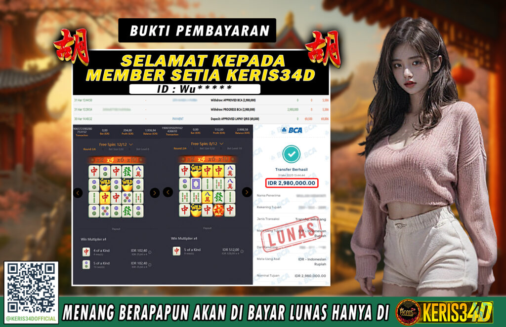 KERIS34D dikenal sebagai situs terpercaya yang selalu menghadirkan pengalaman bermain slot online yang aman, fair, dan berlisensi resmi. Di sini, kami tidak hanya sekadar memberikan janji, tapi bukti nyata berupa slip kemenangan yang dapat Anda lihat secara langsung.