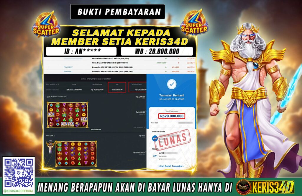 KERIS34D dikenal sebagai situs terpercaya yang selalu menghadirkan pengalaman bermain slot online yang aman, fair, dan berlisensi resmi. Di sini, kami tidak hanya sekadar memberikan janji, tapi bukti nyata berupa slip kemenangan yang dapat Anda lihat secara langsung.