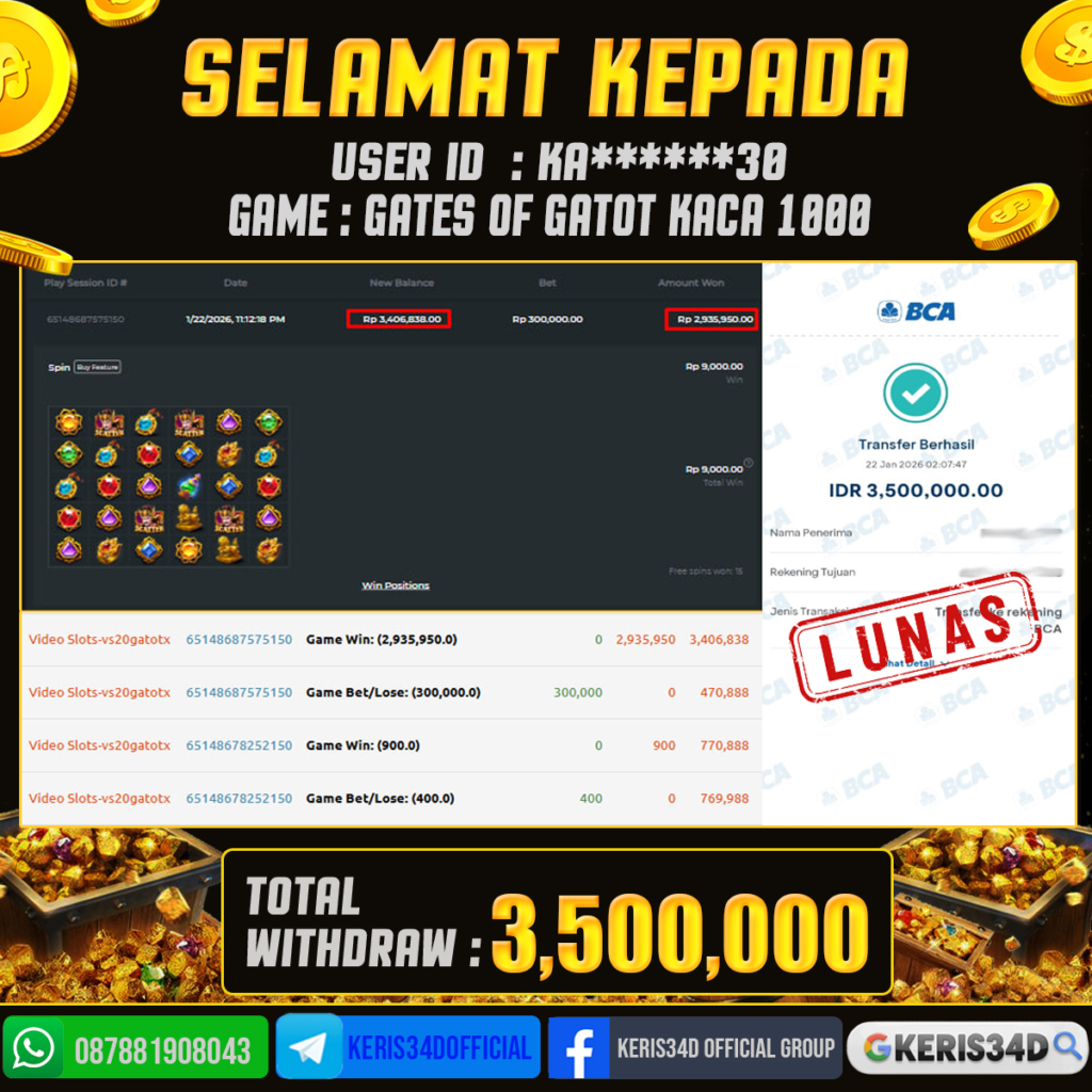 Setiap hari, member KERIS34D berhasil meraih jackpot besar dari berbagai provider slot ternama yang kami sediakan, seperti Pragmatic Play, Habanero, PG Soft, dan masih banyak lagi. Kami secara rutin menampilkan bukti screenshot atau rekapan kemenangan yang berhasil diraih, mulai dari kemenangan ratusan ribu hingga puluhan juta rupiah. Semua slip kemenangan ini kami hadirkan untuk membuktikan bahwa di KERIS34D, peluang menang itu nyata