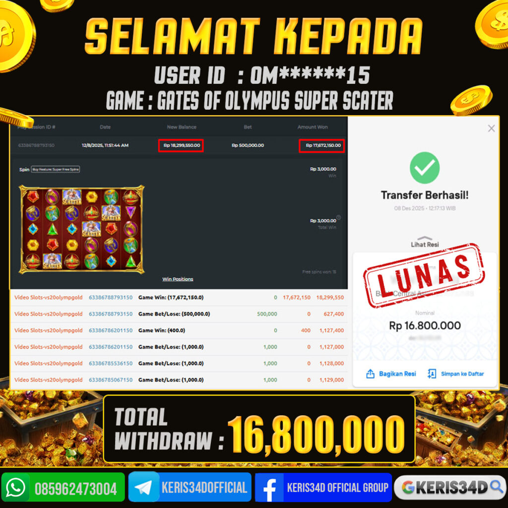 Setiap hari, member KERIS34D berhasil meraih jackpot besar dari berbagai provider slot ternama yang kami sediakan, seperti Pragmatic Play, Habanero, PG Soft, dan masih banyak lagi. Kami secara rutin menampilkan bukti screenshot atau rekapan kemenangan yang berhasil diraih, mulai dari kemenangan ratusan ribu hingga puluhan juta rupiah. Semua slip kemenangan ini kami hadirkan untuk membuktikan bahwa di KERIS34D, peluang menang itu nyata