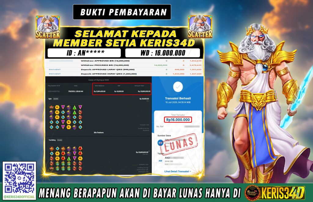 Setiap hari, member KERIS34D berhasil meraih jackpot besar dari berbagai provider slot ternama yang kami sediakan, seperti Pragmatic Play, Habanero, PG Soft, dan masih banyak lagi. Kami secara rutin menampilkan bukti screenshot atau rekapan kemenangan yang berhasil diraih, mulai dari kemenangan ratusan ribu hingga puluhan juta rupiah. Semua slip kemenangan ini kami hadirkan untuk membuktikan bahwa di KERIS34D peluang menang itu nyata