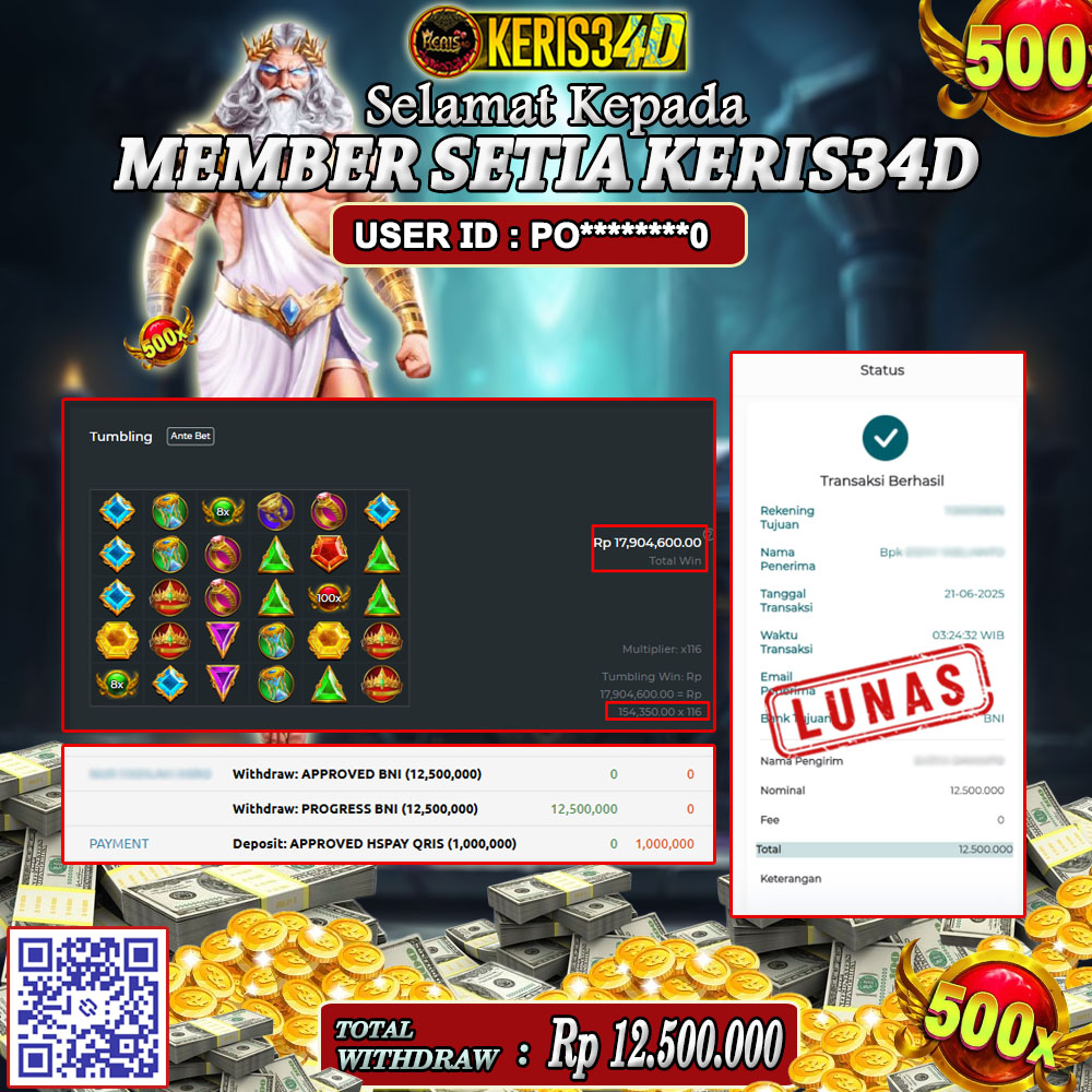 SSetiap hari, member KERIS34D berhasil meraih jackpot besar dari berbagai provider slot ternama yang kami sediakan, seperti Pragmatic Play, Habanero, PG Soft, dan masih banyak lagi. Kami secara rutin menampilkan bukti screenshot atau rekapan kemenangan yang berhasil diraih, mulai dari kemenangan ratusan ribu hingga puluhan juta rupiah. Semua slip kemenangan ini kami hadirkan untuk membuktikan bahwa di KERIS34D peluang menang itu nyata