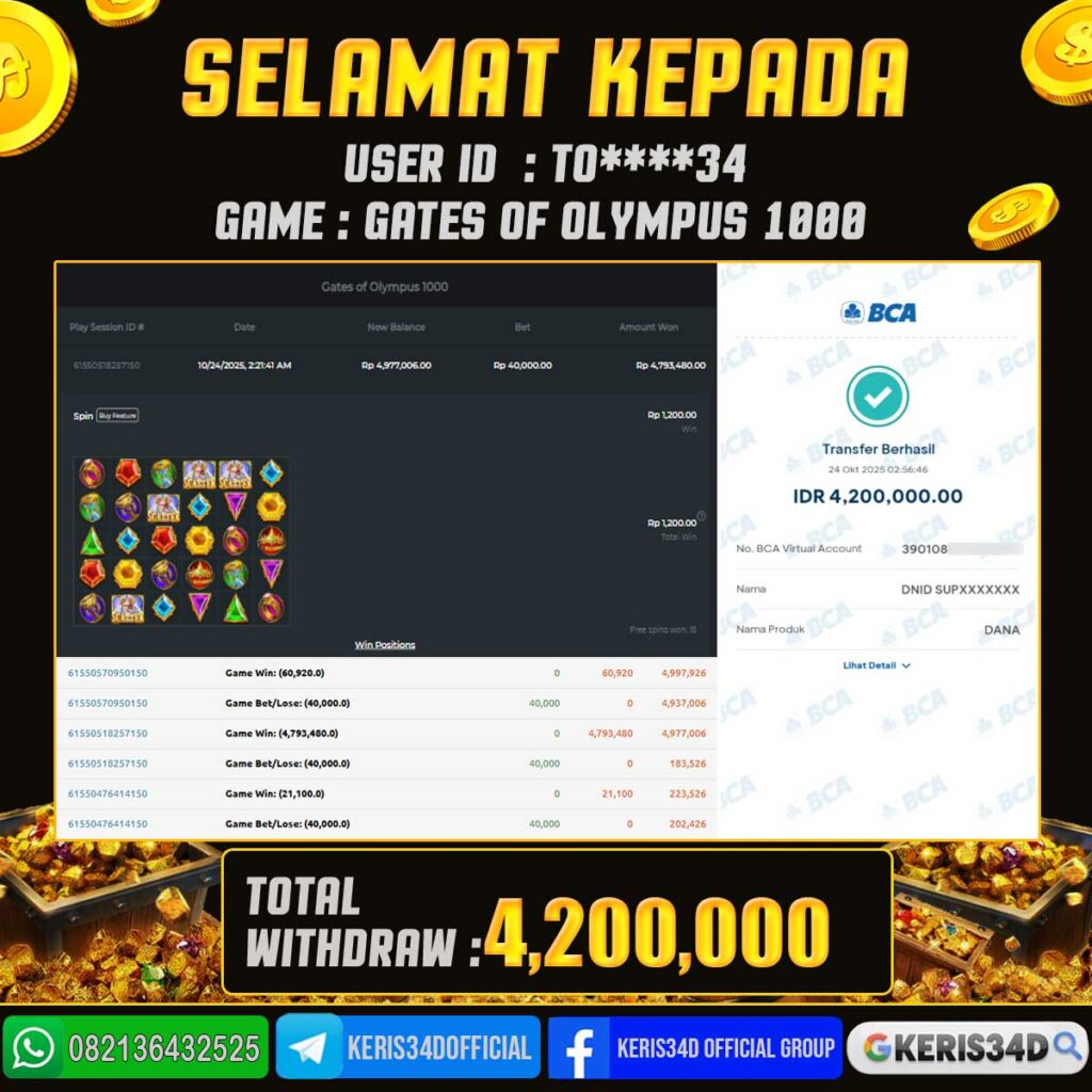 Setiap hari, member KERIS34D berhasil meraih jackpot besar dari berbagai provider slot ternama yang kami sediakan, seperti Pragmatic Play, Habanero, PG Soft, dan masih banyak lagi. Kami secara rutin menampilkan bukti screenshot atau rekapan kemenangan yang berhasil diraih, mulai dari kemenangan ratusan ribu hingga puluhan juta rupiah. Semua slip kemenangan ini kami hadirkan untuk membuktikan bahwa di KERIS34D, peluang menang itu nyata