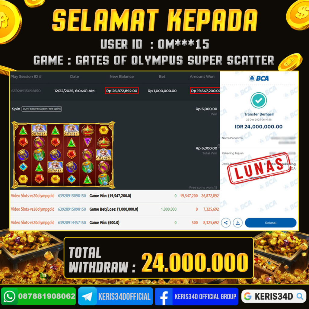 KERIS34D dikenal sebagai situs terpercaya yang selalu menghadirkan pengalaman bermain slot online yang aman, fair, dan berlisensi resmi. Di sini, kami tidak hanya sekadar memberikan janji, tapi bukti nyata berupa slip kemenangan yang dapat Anda lihat secara langsung.