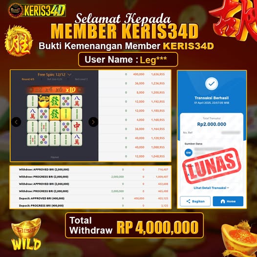 Setiap hari, member KERIS34D berhasil meraih jackpot besar dari berbagai provider slot ternama yang kami sediakan, seperti Pragmatic Play, Habanero, PG Soft, dan masih banyak lagi. Kami secara rutin menampilkan bukti screenshot atau rekapan kemenangan yang berhasil diraih, mulai dari kemenangan ratusan ribu hingga puluhan juta rupiah. Semua slip kemenangan ini kami hadirkan untuk membuktikan bahwa di KERIS34D, peluang menang itu nyata