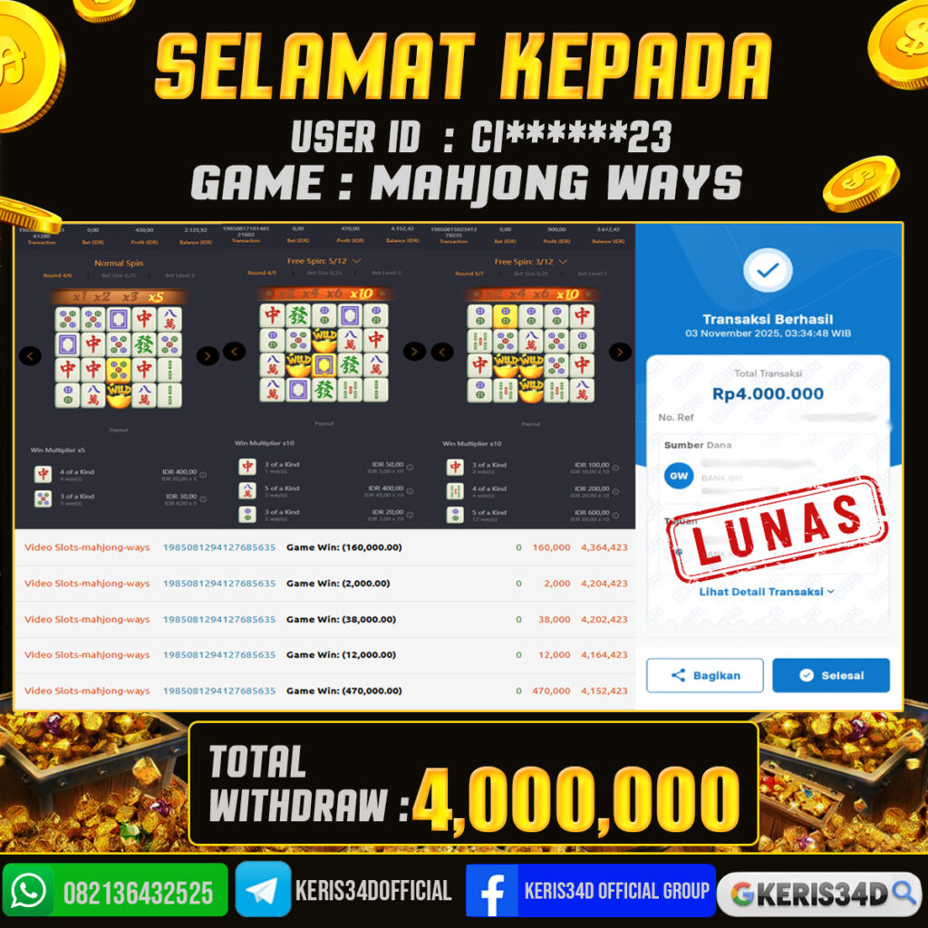 KERIS34D dikenal sebagai situs terpercaya yang selalu menghadirkan pengalaman bermain slot online yang aman, fair, dan berlisensi resmi. Di sini, kami tidak hanya sekadar memberikan janji, tapi bukti nyata berupa slip kemenangan yang dapat Anda lihat secara langsung.