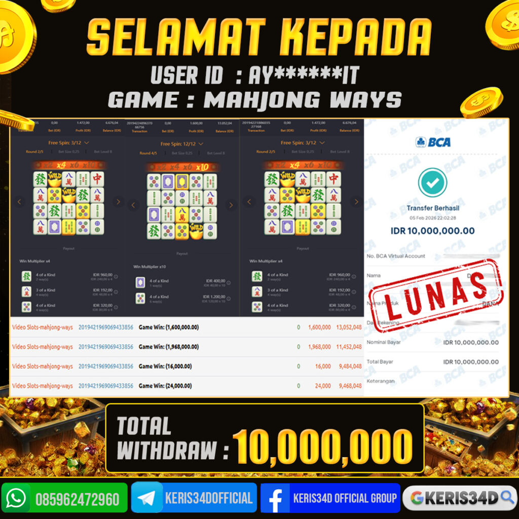 KERIS34D dikenal sebagai situs terpercaya yang selalu menghadirkan pengalaman bermain slot online yang aman, fair, dan berlisensi resmi. Di sini, kami tidak hanya sekadar memberikan janji, tapi bukti nyata berupa slip kemenangan yang dapat Anda lihat secara langsung.