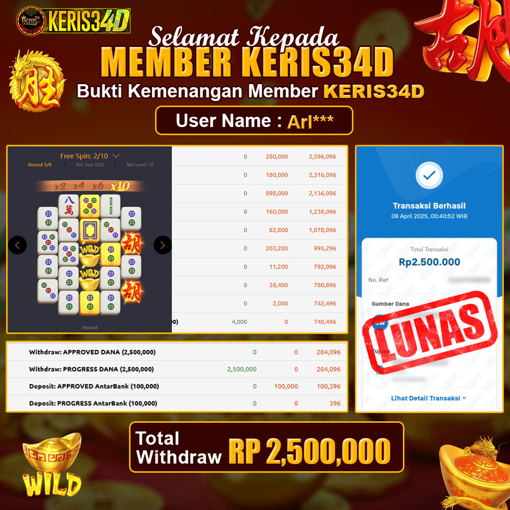 Setiap hari, member KERIS34D berhasil meraih jackpot besar dari berbagai provider slot ternama yang kami sediakan, seperti Pragmatic Play, Habanero, PG Soft, dan masih banyak lagi. Kami secara rutin menampilkan bukti screenshot atau rekapan kemenangan yang berhasil diraih, mulai dari kemenangan ratusan ribu hingga puluhan juta rupiah. Semua slip kemenangan ini kami hadirkan untuk membuktikan bahwa di KERIS34D, peluang menang itu nyata