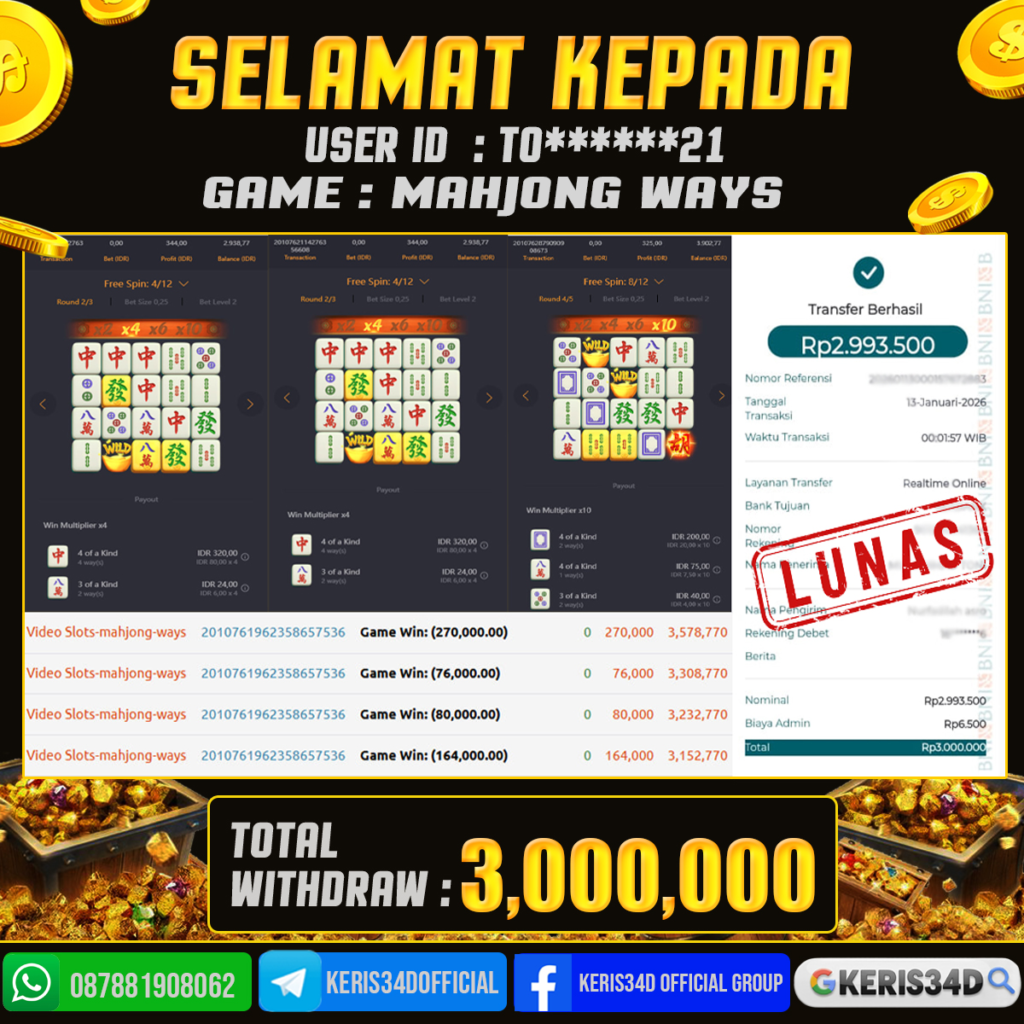 Setiap hari, member KERIS34D berhasil meraih jackpot besar dari berbagai provider slot ternama yang kami sediakan, seperti Pragmatic Play, Habanero, PG Soft, dan masih banyak lagi. Kami secara rutin menampilkan bukti screenshot atau rekapan kemenangan yang berhasil diraih, mulai dari kemenangan ratusan ribu hingga puluhan juta rupiah. Semua slip kemenangan ini kami hadirkan untuk membuktikan bahwa di KERIS34D, peluang menang itu nyata