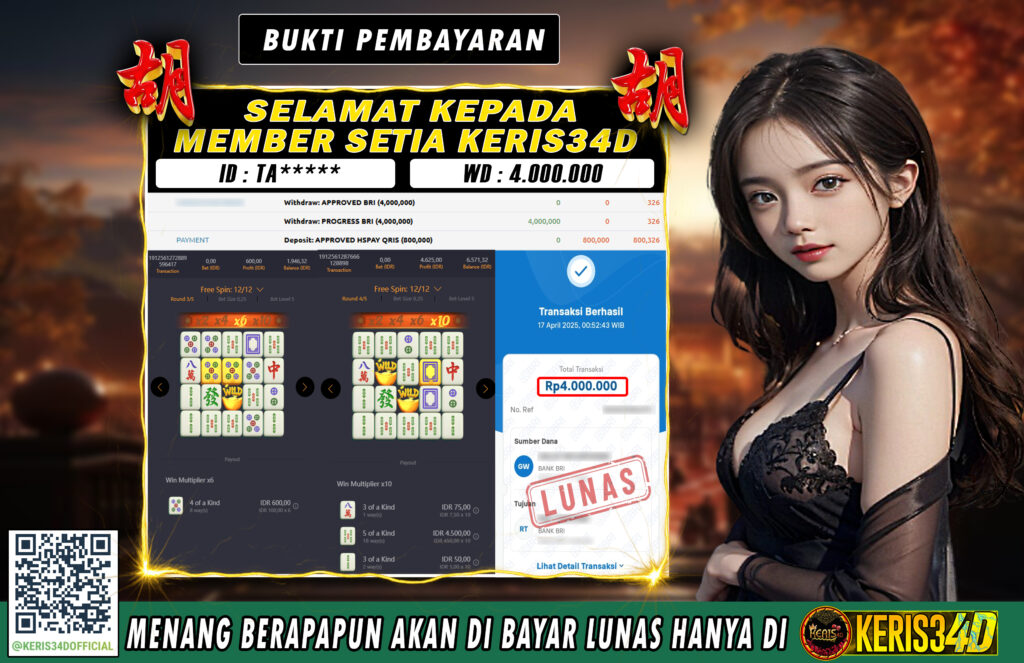 Setiap hari, member KERIS34D berhasil meraih jackpot besar dari berbagai provider slot ternama yang kami sediakan, seperti Pragmatic Play, Habanero, PG Soft, dan masih banyak lagi. Kami secara rutin menampilkan bukti screenshot atau rekapan kemenangan yang berhasil diraih, mulai dari kemenangan ratusan ribu hingga puluhan juta rupiah. Semua slip kemenangan ini kami hadirkan untuk membuktikan bahwa di KERIS34D, peluang menang itu nyata