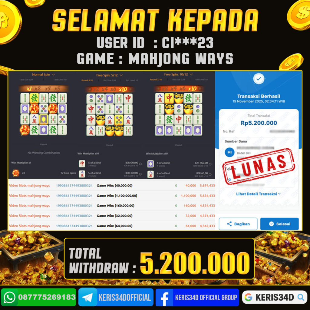 KERIS34D dikenal sebagai situs terpercaya yang selalu menghadirkan pengalaman bermain slot online yang aman, fair, dan berlisensi resmi. Di sini, kami tidak hanya sekadar memberikan janji, tapi bukti nyata berupa slip kemenangan yang dapat Anda lihat secara langsung.