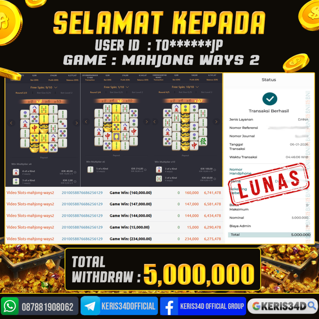 Setiap hari, member KERIS34D berhasil meraih jackpot besar dari berbagai provider slot ternama yang kami sediakan, seperti Pragmatic Play, Habanero, PG Soft, dan masih banyak lagi. Kami secara rutin menampilkan bukti screenshot atau rekapan kemenangan yang berhasil diraih, mulai dari kemenangan ratusan ribu hingga puluhan juta rupiah. Semua slip kemenangan ini kami hadirkan untuk membuktikan bahwa di KERIS34D, peluang menang itu nyata