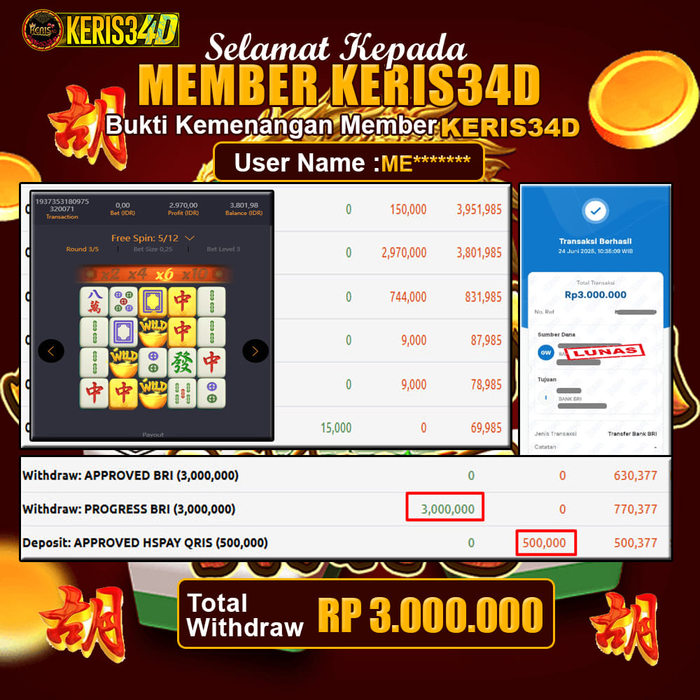 Setiap hari, member KERIS34D berhasil meraih jackpot besar dari berbagai provider slot ternama yang kami sediakan, seperti Pragmatic Play, Habanero, PG Soft, dan masih banyak lagi. Kami secara rutin menampilkan bukti screenshot atau rekapan kemenangan yang berhasil diraih, mulai dari kemenangan ratusan ribu hingga puluhan juta rupiah. Semua slip kemenangan ini kami hadirkan untuk membuktikan bahwa di KERIS34D, peluang menang itu nyata