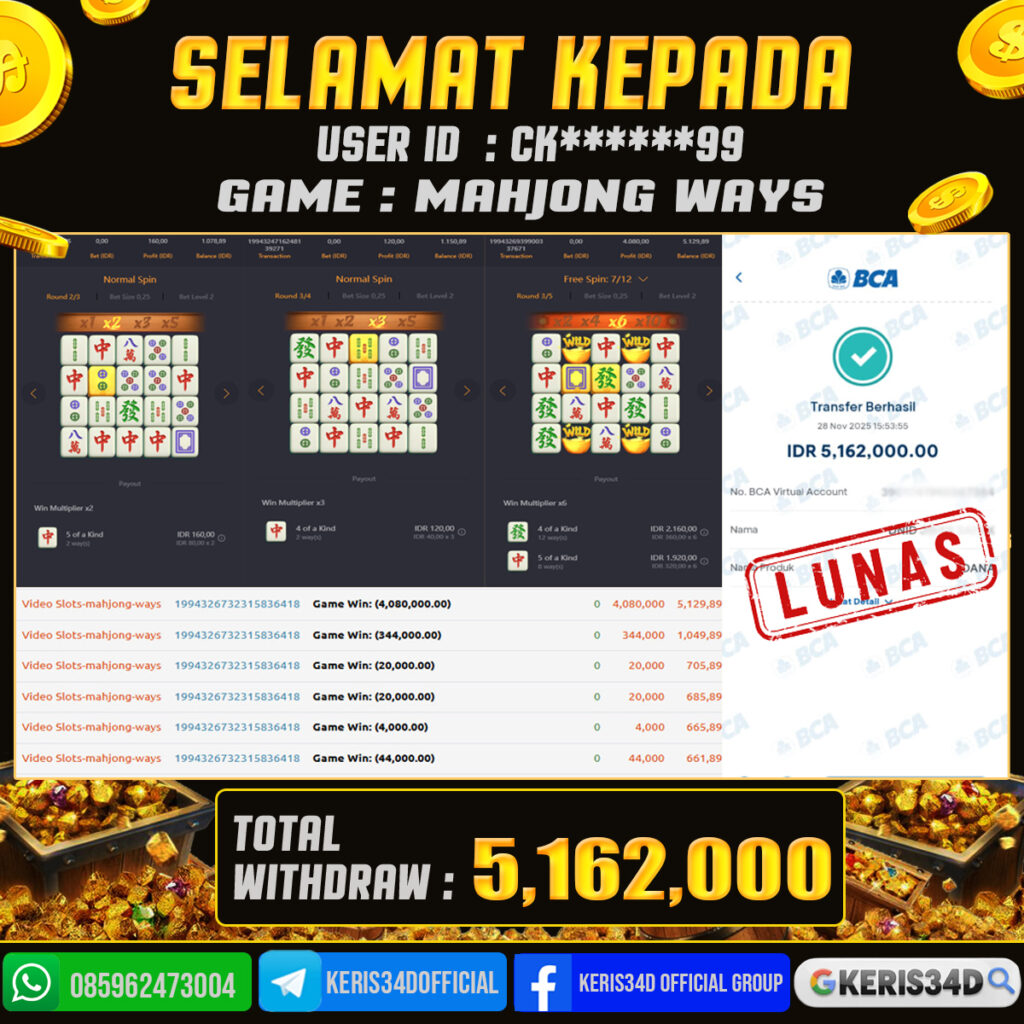 Setiap hari, member KERIS34D berhasil meraih jackpot besar dari berbagai provider slot ternama yang kami sediakan, seperti Pragmatic Play, Habanero, PG Soft, dan masih banyak lagi. Kami secara rutin menampilkan bukti screenshot atau rekapan kemenangan yang berhasil diraih, mulai dari kemenangan ratusan ribu hingga puluhan juta rupiah. Semua slip kemenangan ini kami hadirkan untuk membuktikan bahwa di KERIS34D, peluang menang itu nyata