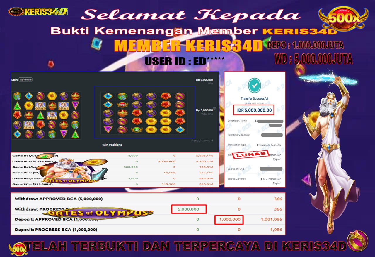 Setiap hari, member KERIS34D berhasil meraih jackpot besar dari berbagai provider slot ternama yang kami sediakan, seperti Pragmatic Play, Habanero, PG Soft, dan masih banyak lagi. Kami secara rutin menampilkan bukti screenshot atau rekapan kemenangan yang berhasil diraih, mulai dari kemenangan ratusan ribu hingga puluhan juta rupiah. Semua slip kemenangan ini kami hadirkan untuk membuktikan bahwa di KERIS34D, peluang menang itu nyata.