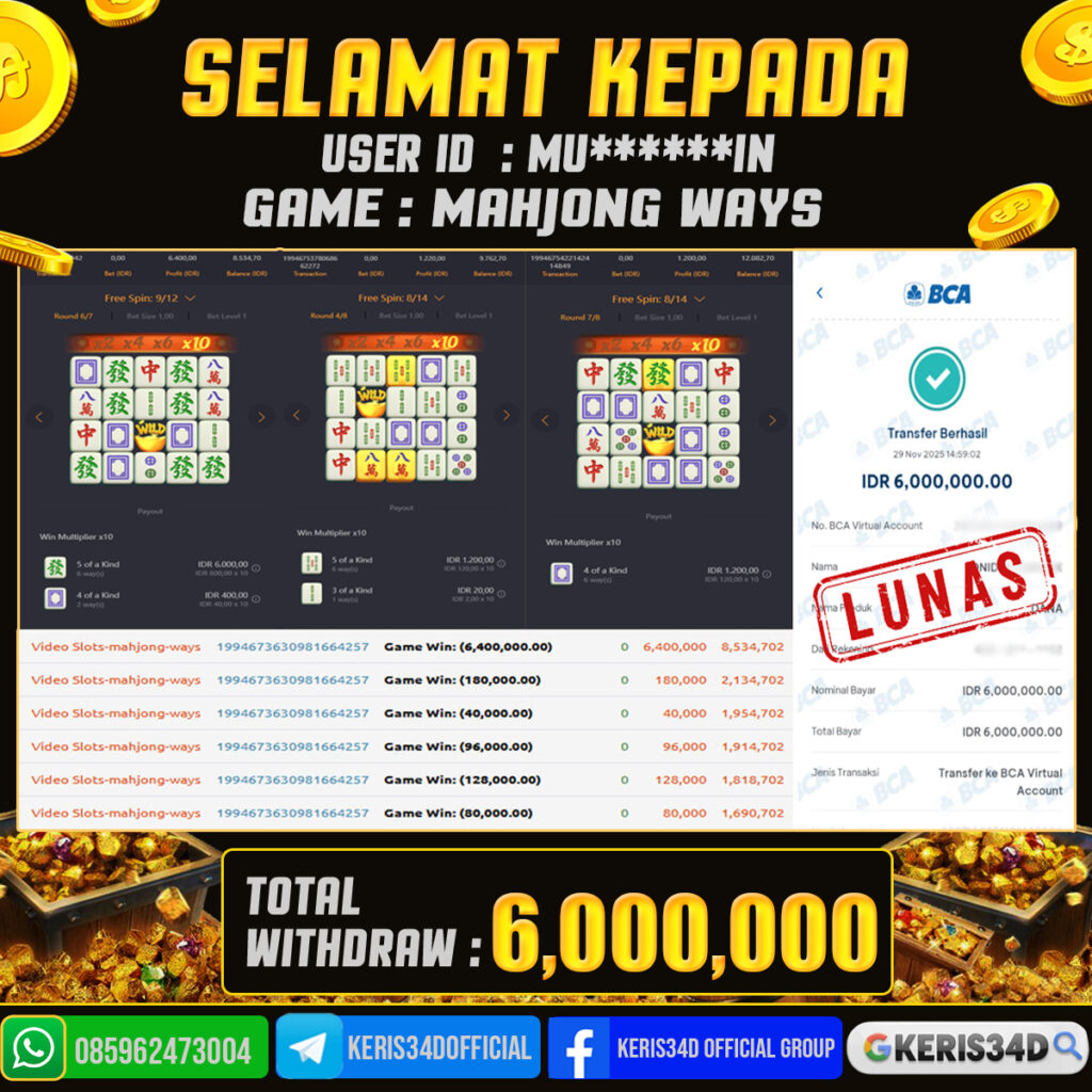 Setiap hari, member KERIS34D berhasil meraih jackpot besar dari berbagai provider slot ternama yang kami sediakan, seperti Pragmatic Play, Habanero, PG Soft, dan masih banyak lagi. Kami secara rutin menampilkan bukti screenshot atau rekapan kemenangan yang berhasil diraih, mulai dari kemenangan ratusan ribu hingga puluhan juta rupiah. Semua slip kemenangan ini kami hadirkan untuk membuktikan bahwa di KERIS34D, peluang menang itu nyata