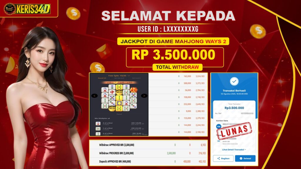 Setiap hari, member KERIS34D berhasil meraih jackpot besar dari berbagai provider slot ternama yang kami sediakan, seperti Pragmatic Play, Habanero, PG Soft, dan masih banyak lagi. Kami secara rutin menampilkan bukti screenshot atau rekapan kemenangan yang berhasil diraih, mulai dari kemenangan ratusan ribu hingga puluhan juta rupiah. Semua slip kemenangan ini kami hadirkan untuk membuktikan bahwa di KERIS34D, peluang menang itu nyata