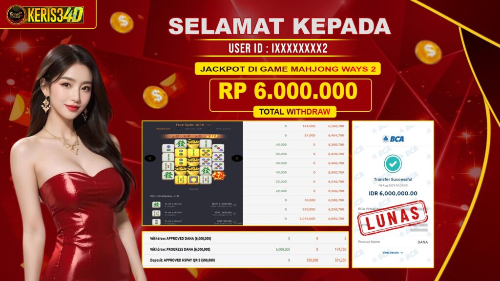 Setiap hari, member KERIS34D berhasil meraih jackpot besar dari berbagai provider slot ternama yang kami sediakan, seperti Pragmatic Play, Habanero, PG Soft, dan masih banyak lagi. Kami secara rutin menampilkan bukti screenshot atau rekapan kemenangan yang berhasil diraih, mulai dari kemenangan ratusan ribu hingga puluhan juta rupiah. Semua slip kemenangan ini kami hadirkan untuk membuktikan bahwa di KERIS34D, peluang menang itu nyata