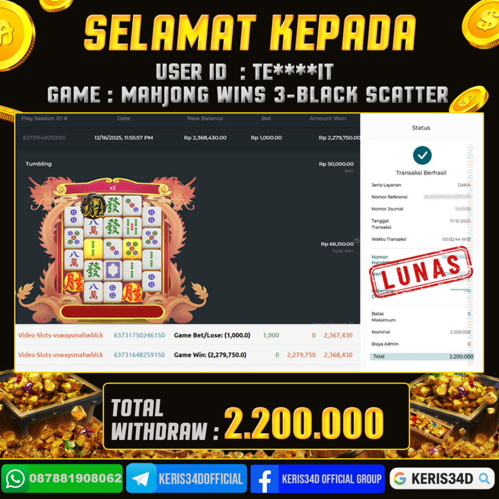 JACKPOT SLOT GACOR MAIN MAHJONG WINS 3 – BLACK SCATTER 17 DESEMBER 2025, Jackpot Slot Gacor, Kemenangan Slot, Bukti Kemenangan Slot, Kemenangan PRAGMATIC PLAY, Menang Slot online, Slot Gacor, Situs Aman Terpercaya, WD Berapapun Pasti DI Bayar Tuntas, Maxwin Slot Online.