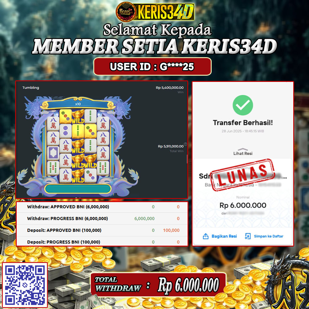 Setiap hari, member KERIS34D berhasil meraih jackpot besar dari berbagai provider slot ternama yang kami sediakan, seperti Pragmatic Play, Habanero, PG Soft, dan masih banyak lagi. Kami secara rutin menampilkan bukti screenshot atau rekapan kemenangan yang berhasil diraih, mulai dari kemenangan ratusan ribu hingga puluhan juta rupiah. Semua slip kemenangan ini kami hadirkan untuk membuktikan bahwa di KERIS34D, peluang menang itu nyata