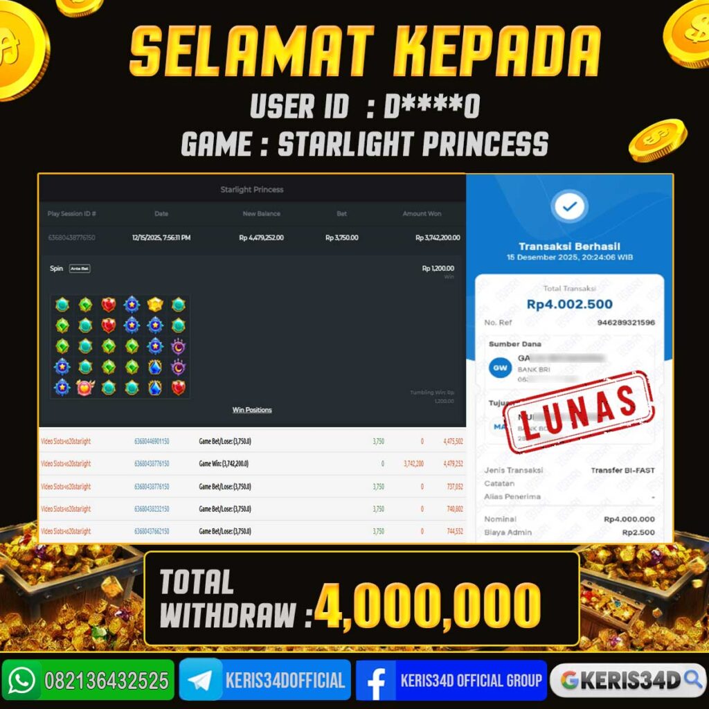 KERIS34D dikenal sebagai situs terpercaya yang selalu menghadirkan pengalaman bermain slot online yang aman, fair, dan berlisensi resmi. Di sini, kami tidak hanya sekadar memberikan janji, tapi bukti nyata berupa slip kemenangan yang dapat Anda lihat secara langsung.