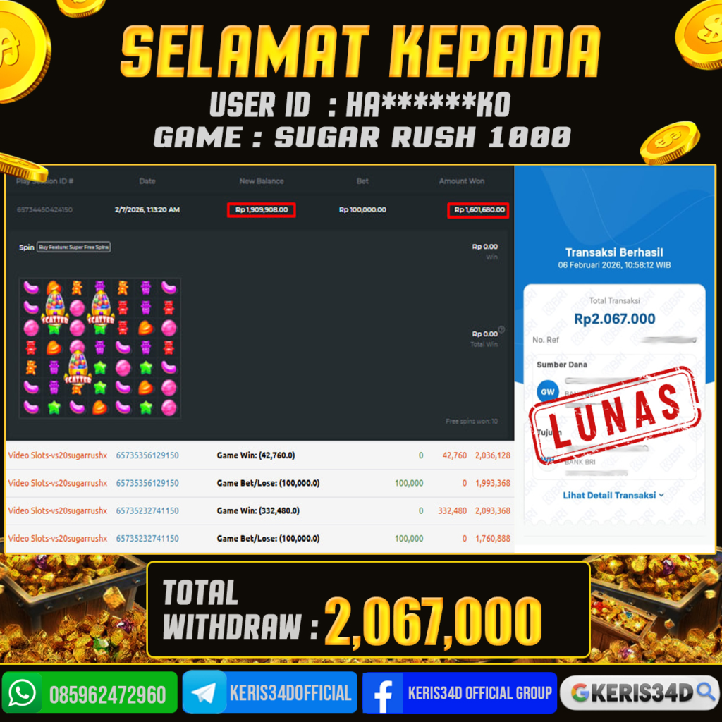 JACKPOT SLOT GACOR SUGAR RUSH 1000 07 FEBRUARI 2026, Jackpot Slot Gacor, Kemenangan Slot, Bukti Kemenangan Slot, Kemenangan PRAGMATIC PLAY, Menang Slot online, Slot Gacor, Situs Aman Terpercaya, WD Berapapun Pasti DI Bayar Tuntas, Maxwin Slot Online.