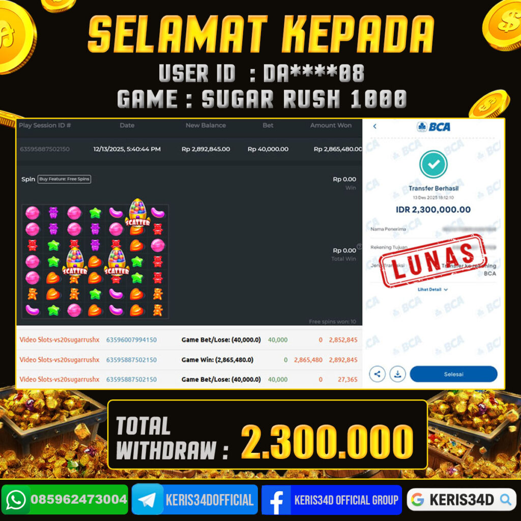 JACKPOT SLOT GACOR SUGAR RUSH 1000 13 DESEMBER2025, Jackpot Slot Gacor, Kemenangan Slot, Bukti Kemenangan Slot, Kemenangan PRAGMATIC PLAY, Menang Slot online, Slot Gacor, Situs Aman Terpercaya, WD Berapapun Pasti DI Bayar Tuntas, Maxwin Slot Online.