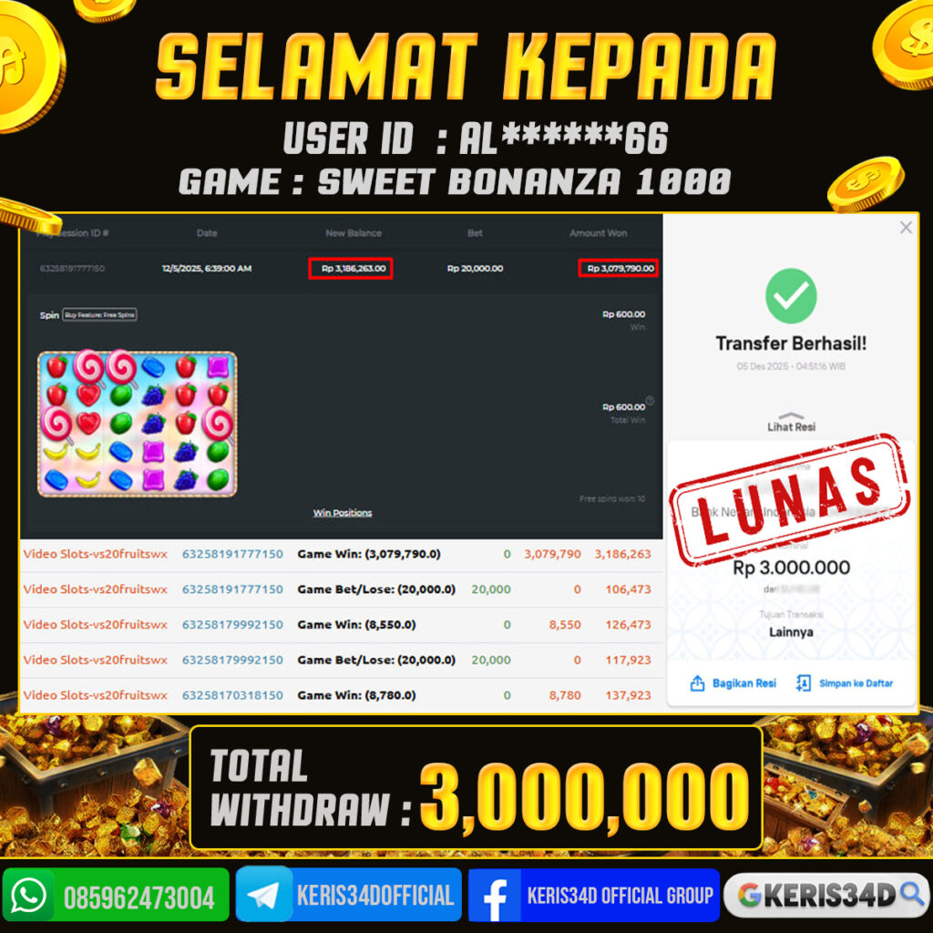 KERIS34D dikenal sebagai situs terpercaya yang selalu menghadirkan pengalaman bermain slot online yang aman, fair, dan berlisensi resmi. Di sini, kami tidak hanya sekadar memberikan janji, tapi bukti nyata berupa slip kemenangan yang dapat Anda lihat secara langsung.