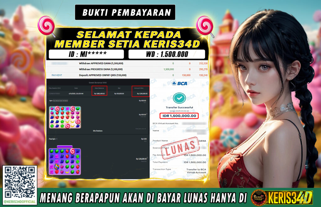 Setiap hari, member KERIS34D berhasil meraih jackpot besar dari berbagai provider slot ternama yang kami sediakan, seperti Pragmatic Play, Habanero, PG Soft, dan masih banyak lagi. Kami secara rutin menampilkan bukti screenshot atau rekapan kemenangan yang berhasil diraih, mulai dari kemenangan ratusan ribu hingga puluhan juta rupiah. Semua slip kemenangan ini kami hadirkan untuk membuktikan bahwa di KERIS34D, peluang menang itu nyata