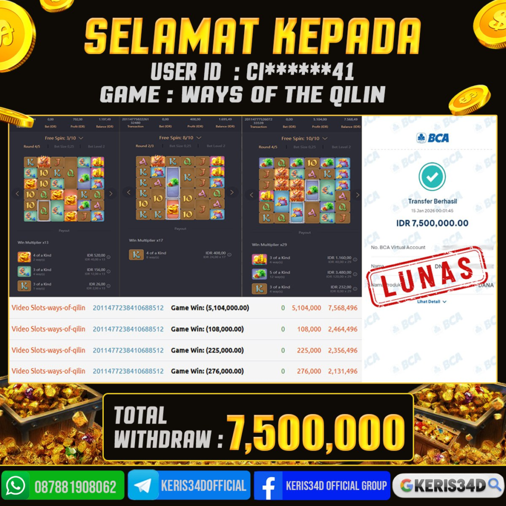 JACKPOT SLOT GACOR MAIN WAYS OF THE QILIN 15 JANUARI 2026, Jackpot Slot Gacor, Kemenangan Slot, Bukti Kemenangan Slot, Kemenangan PGSOFT, Menang Slot online, Slot Gacor, Situs Aman Terpercaya, WD Berapapun Pasti DI Bayar Tuntas, Maxwin Slot Online.