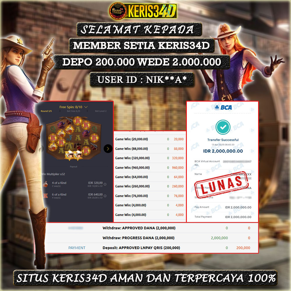 Setiap hari, member KERIS34D berhasil meraih jackpot besar dari berbagai provider slot ternama yang kami sediakan, seperti Pragmatic Play, Habanero, PG Soft, dan masih banyak lagi. Kami secara rutin menampilkan bukti screenshot atau rekapan kemenangan yang berhasil diraih, mulai dari kemenangan ratusan ribu hingga puluhan juta rupiah. Semua slip kemenangan ini kami hadirkan untuk membuktikan bahwa di KERIS34D, peluang menang itu nyata
