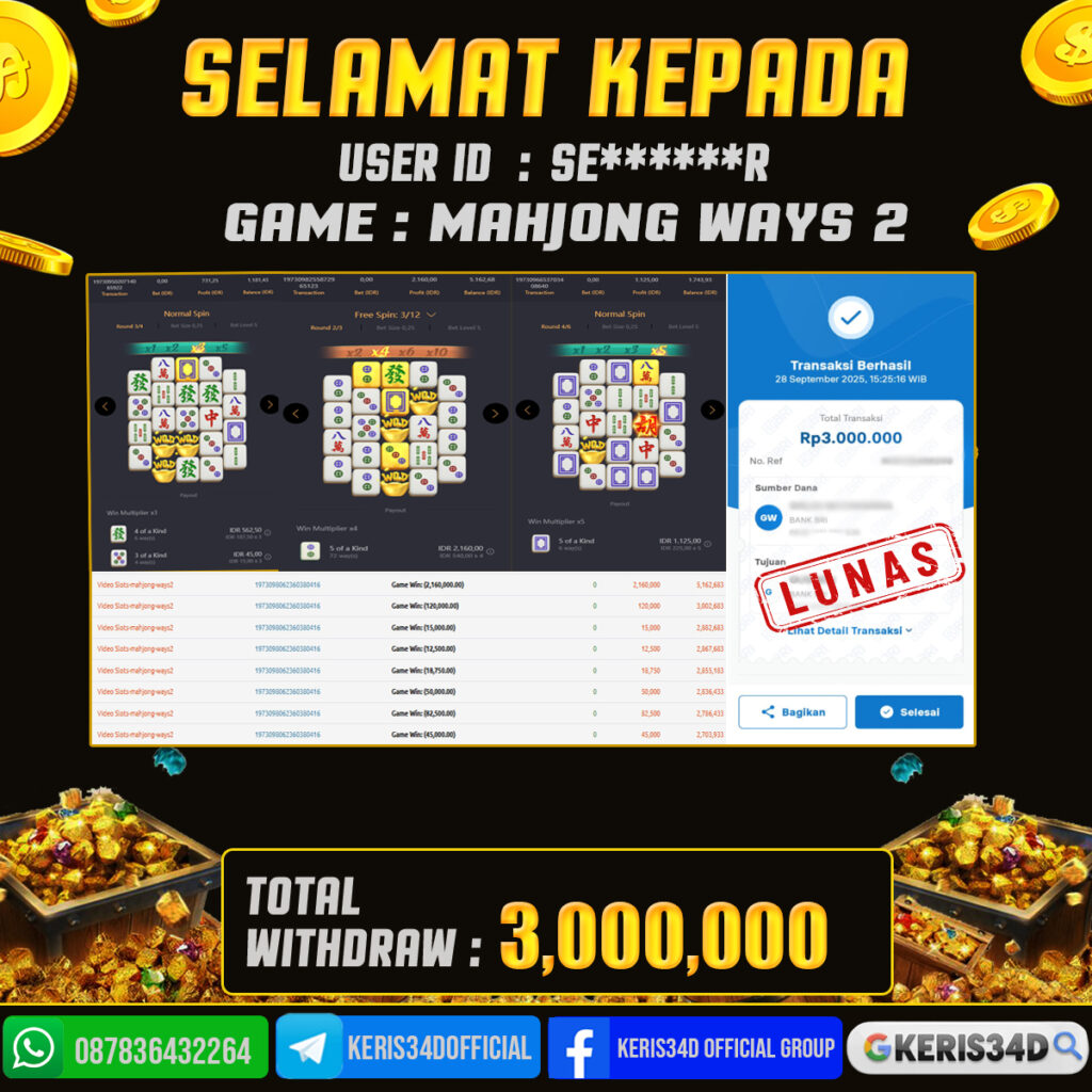 Setiap hari, member KERIS34D berhasil meraih jackpot besar dari berbagai provider slot ternama yang kami sediakan, seperti Pragmatic Play, Habanero, PG Soft, dan masih banyak lagi. Kami secara rutin menampilkan bukti screenshot atau rekapan kemenangan yang berhasil diraih, mulai dari kemenangan ratusan ribu hingga puluhan juta rupiah. Semua slip kemenangan ini kami hadirkan untuk membuktikan bahwa di KERIS34D, peluang menang itu nyata